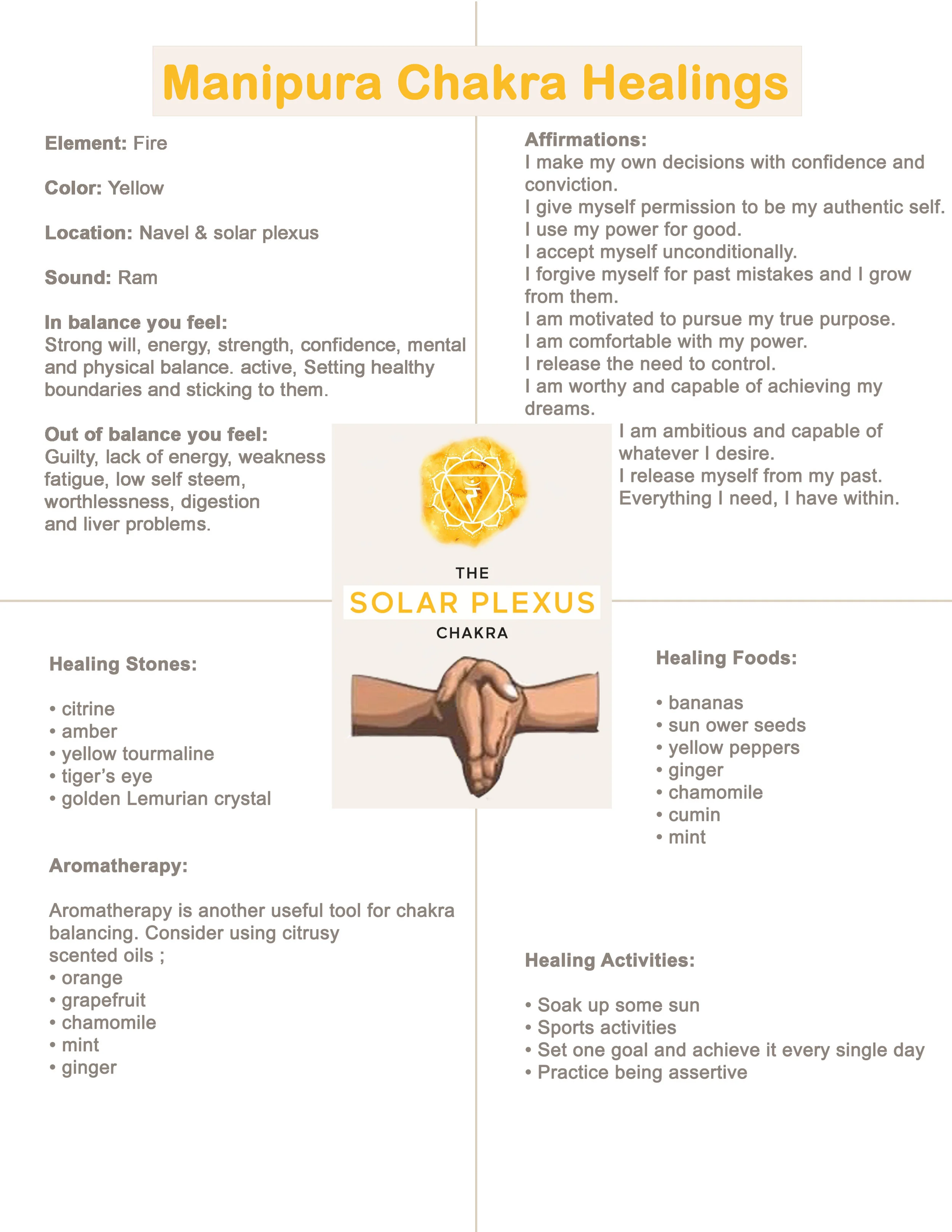 Allow me to leave you to explore what this chakra means to you and how you can find your connection to balancing this energy. Use the below handout to explore so many different ways and aspects that you can awaken and heal this space. But remember fire will transform and melt the ego, however too much fire can burn us down. Great opportunity to take time and explore balancing the three chakras you have explored , from root (earth energy) to being in the flow and allowing your creativity to be fluid (water energy), to adding the element of fire to the mix and allowing the heating sun energy awaken the inner power and find balance between all three.